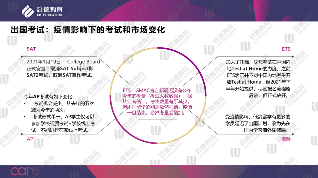 與此同時,國產(chǎn)疫苗被海外多國認(rèn)可。此外,各種跡象表明,作為最主要的留學(xué)語言,2021年英語考試認(rèn)證已放寬,考點也在增多。除了日本37所知名院校開展全英文授課外,韓國也可用英語成績遞交申請,法國提供1700個左右的英文授課課程,荷蘭碩士英語授課覆蓋率為95%,英語普及率在全世界非英語母語國家中最高。2021年1月19日,College Board正式宣布取消SAT Subject即SAT2考試,取消SAT寫作考試。2021年下半年 ETS對中國內(nèi)地考生開放Test at Home。同年,BC也在加快在中國內(nèi)地的雅思機考考點建設(shè)速度,計劃2022年將雅思機考考點覆蓋內(nèi)地四十多個城市。