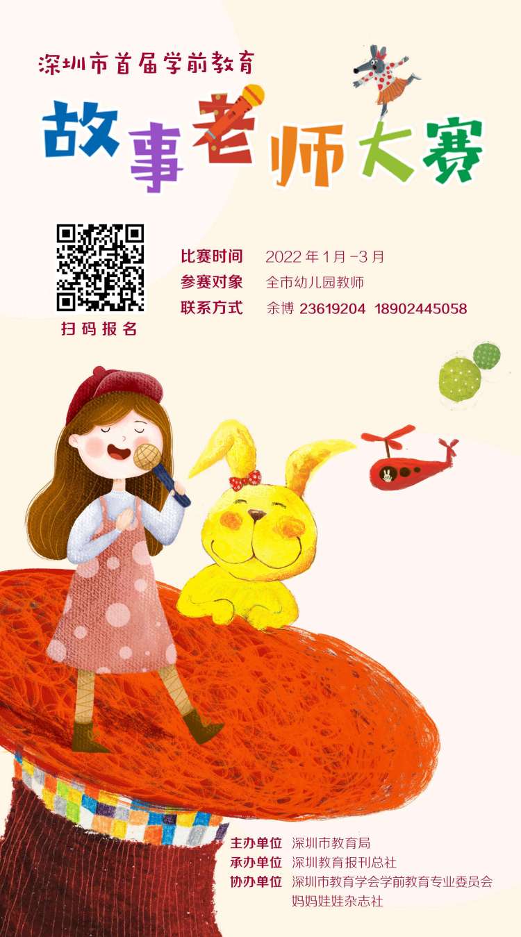 讀特客戶端·深圳新聞網(wǎng)2022年1月12日訊 (記者 陳彬 通訊員 程玉珂)由深圳市教育局主辦,深圳教育報(bào)刊總社承辦,深圳市教育學(xué)會學(xué)前教育專業(yè)委員會、媽媽娃娃雜志社協(xié)辦的深圳市首屆學(xué)前教育“故事老師”大賽暨原創(chuàng)繪本大賽將于2022年1-3月舉辦。