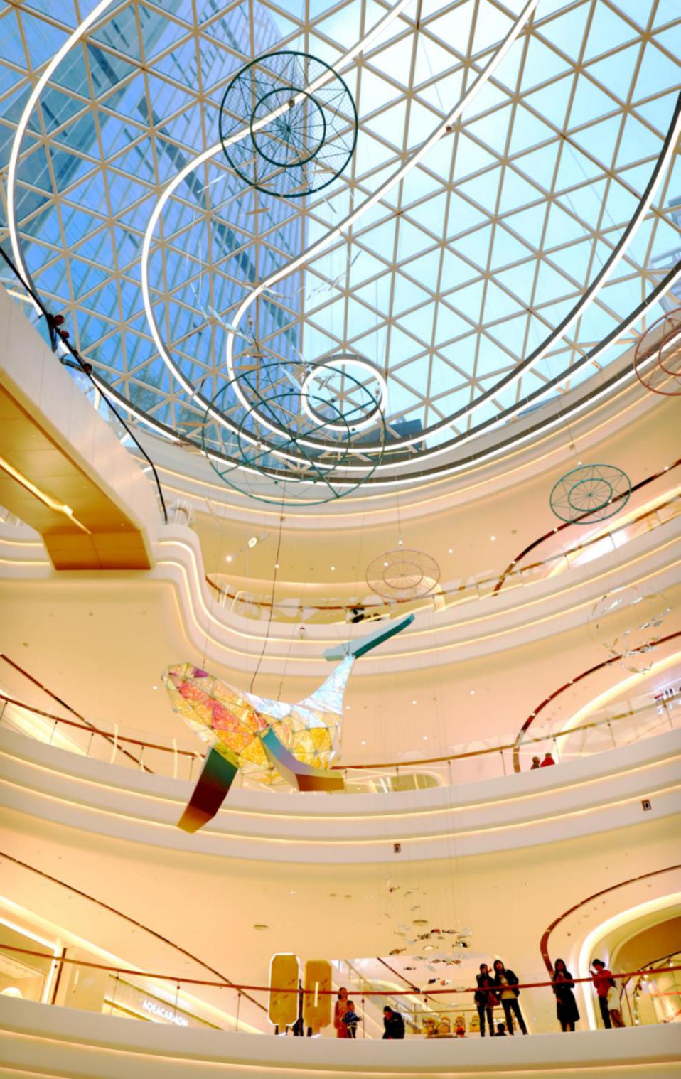 水中庭海之心 LED互動(dòng)地幕秀,隨時(shí)與深海精靈上演親密接觸,內(nèi)設(shè)跨層螺旋星語(yǔ)滑梯,讓人們回歸童年的冒險(xiǎn)世界;木中庭,“凈化”城市呼吸系統(tǒng)的鮮氧氣泡,向下“生長(zhǎng)”的繁茂大樹(shù),如同漫游在森意盎然的自然幻境;花中庭,澆灌“蒲公英”主題跨層挑臺(tái),生長(zhǎng)出城市里的秘密花園。同時(shí),打造玻璃之森、室內(nèi)養(yǎng)魚(yú)池兩大自然微景觀,將生態(tài)之靈氣納入方寸之間。