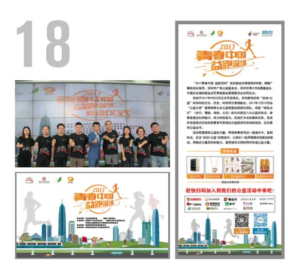 由深圳市廣電公益基金會(huì)、深圳市青少年發(fā)展基金會(huì)等主辦,深圳棠果影視傳媒有限公司承辦?!?017青春中國(guó)益跑深圳”活動(dòng)作為創(chuàng)意公益募捐慈善活動(dòng),通過招募深圳市民自愿以“綠色出行”(步行、慢跑、地鐵、公交)的方式完成城市穿越,從而為10個(gè)社會(huì)慈善項(xiàng)目進(jìn)行募捐的大型公益活動(dòng)。