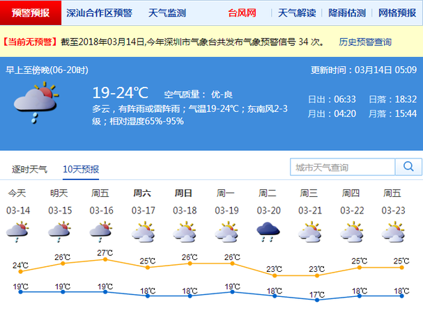 深圳新聞網3月14日訊(記者 何暢)深圳市氣象臺3月14日05:09發(fā)布,14-15日多云有陣雨或雷陣雨;16日陣雨轉多云,沿海有霧;17-18日多云;19日多云轉分散陣雨。