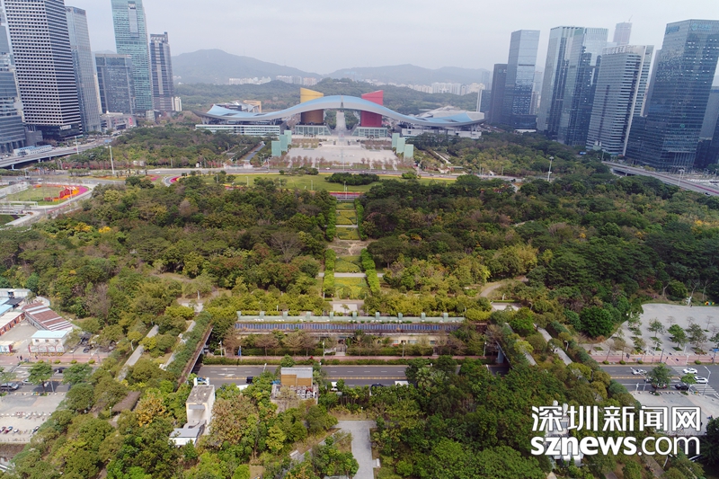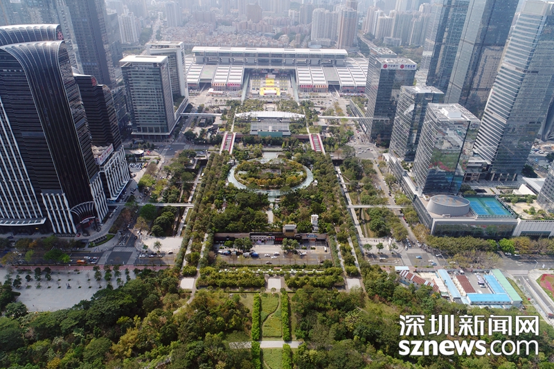 2018年,深圳新聞網(wǎng)無人機拍攝下的福田中心區(qū)會展中心附近建筑群及綠地