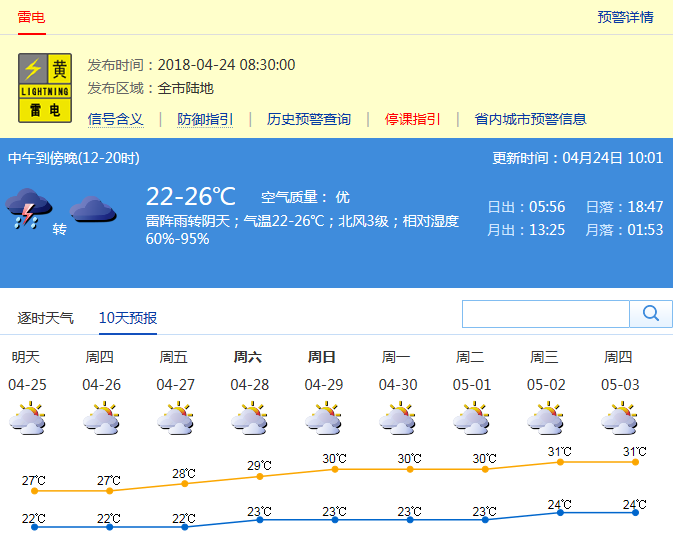 【深圳市雷電預警】深圳市氣象臺于2018年04月24日08時30分在全市陸地發(fā)布雷電預警,預計30分鐘內(nèi)全市將受雷電影響,按照防御預案停止戶外易燃易爆危險作業(yè),并加強?;瘓鏊踩芾?。