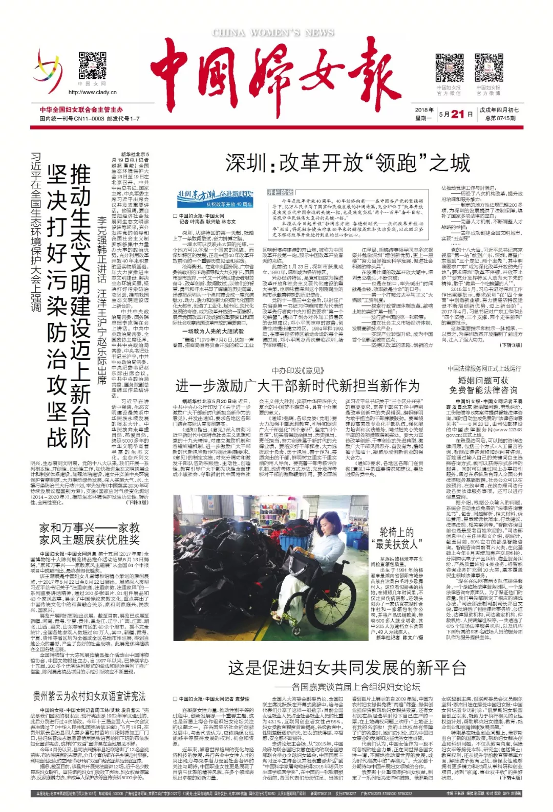 這是《中國婦女報》2018年5月21日一版版面。
