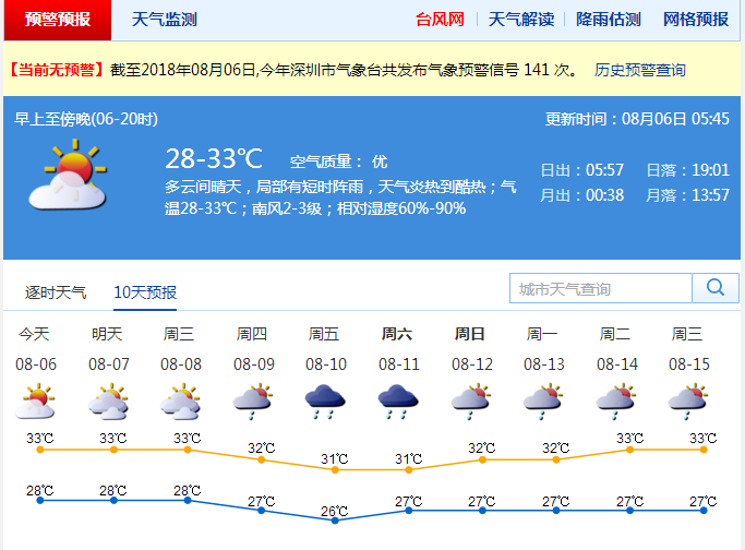 多云仍是今日深圳天氣的主格調(diào),部分時(shí)間陽(yáng)光猛烈,局部還會(huì)出現(xiàn)短時(shí)陣雨或雷陣雨。氣溫較高,最低氣溫在28℃左右,最高氣溫升至33℃左右,北部及人口密集區(qū)的氣溫將達(dá)34-35℃。外出應(yīng)注意防曬,中午前后應(yīng)減少戶(hù)外活動(dòng)。