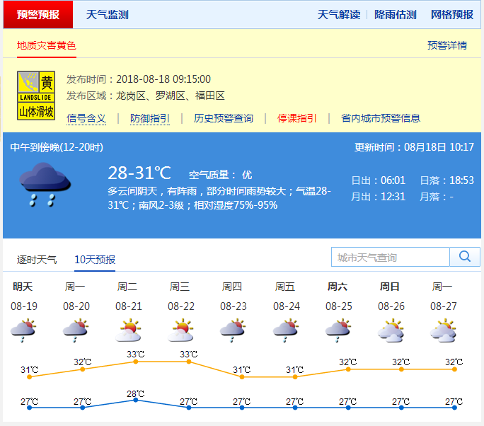 深圳市氣象臺(tái)預(yù)計(jì),18日深圳多云間陰天,有陣雨,部分時(shí)間雨勢較大,氣溫26-30℃;19日多云有陣雨或雷陣雨;20-23日多云,有短時(shí)陣雨,陽光增多,天氣趨于炎熱。