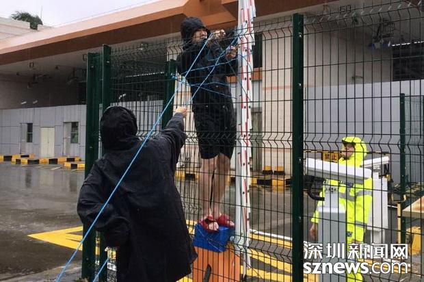 邊檢民警冒雨在拾取被強(qiáng)臺(tái)風(fēng)掀倒現(xiàn)場(chǎng)通關(guān)標(biāo)識(shí)牌