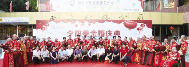 蛇口街道南水社區(qū)居民耿玉璽與王月鳳兩位老人已經(jīng)攜手走過69年,一直有個(gè)遺憾藏在心里——兩人年輕時(shí)沒有舉辦過婚禮,連一張結(jié)婚照片都沒有。日前,二老的遺憾得到彌補(bǔ),愿望得以實(shí)現(xiàn)。南水社區(qū)黨委以開展民生微實(shí)事為契機(jī),為包括耿玉璽與王月鳳夫婦在內(nèi)的社區(qū)15對(duì)老年夫婦舉辦了一場(chǎng)別開生面的夕陽美集體金婚慶典活動(dòng)。眾多嘉賓及老人的親朋好友、子女兒孫到場(chǎng)見證,獻(xiàn)上掌聲和祝福。