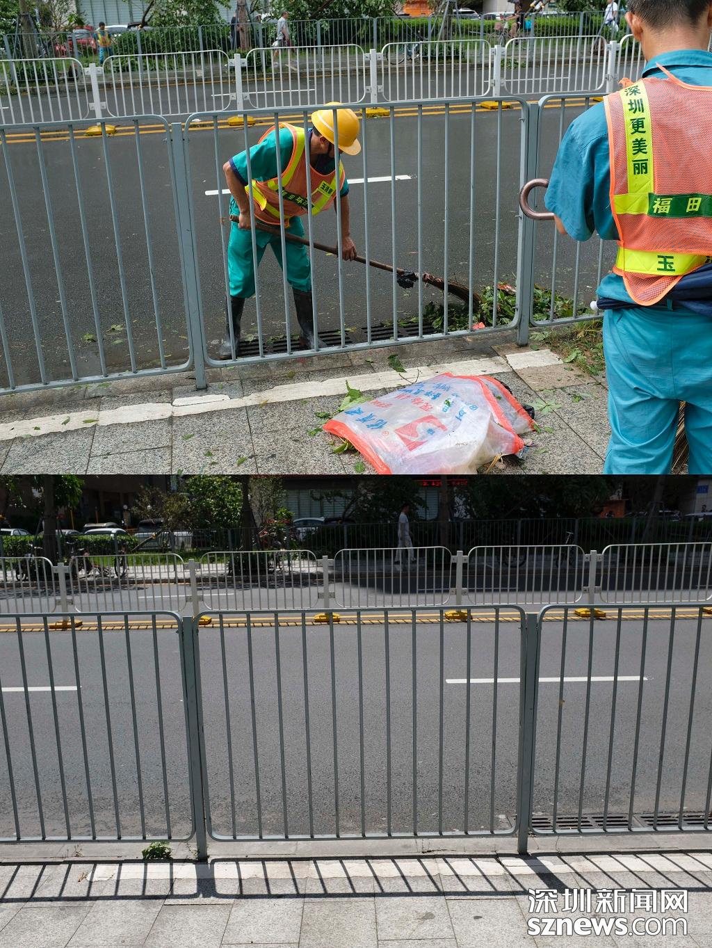 石夏地鐵站E出口清理前后對(duì)比(上圖:2018年9月17日,臺(tái)風(fēng)過后,環(huán)衛(wèi)工人正在清掃落葉。下圖2018年9月18日早上,路面已經(jīng)清掃完畢,變得更整潔)