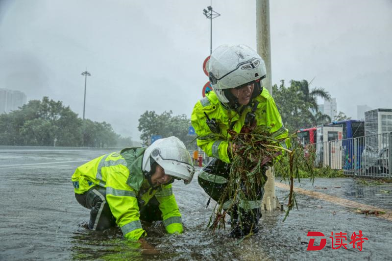 但是,眼前的情況,他們無法視而不見。深鹽二通道下方,羅沙路羅湖公安分局調(diào)頭口處,當艾力軍經(jīng)過這里時發(fā)現(xiàn)由于地勢低洼路面已經(jīng)嚴重積水,他們馬上停下車,疏通下水道。一行人在風雨中走進機動車道,沿著路邊只能用手在積水中摸索排水口的位置,將阻塞入水口的樹枝樹葉掏出來。但風急雨驟,道路積水水位剛下降一點,剛被清理的下水道又堵樹葉、樹枝等雜物堵上,他們只好不斷地進行著重復的動作。而此時,臺風“山竹”距離深圳接近130公里,羅湖片區(qū)測得最大陣風達16級。