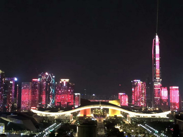 這臺(tái)別開生面的晚會(huì),主舞臺(tái)設(shè)在市民中心廣場(chǎng),舞臺(tái)后方呈現(xiàn)著深圳市精心打造的福田中心區(qū)43座樓宇燈光秀,五彩斑斕、綺麗多姿的深圳城市新夜景,與晚會(huì)現(xiàn)場(chǎng)舞臺(tái)融為一體,為市民和廣大觀眾呈現(xiàn)出一個(gè)迷人的“深圳之夜”。