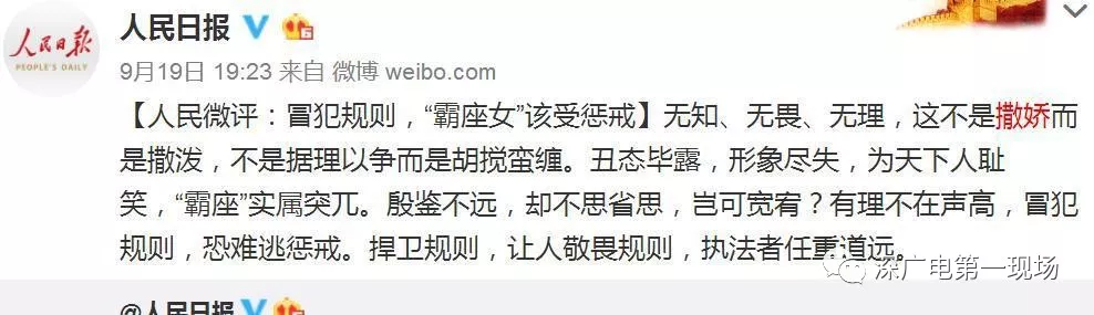 對此,@人民日報(bào)官方微博昨晚發(fā)表評論【冒犯規(guī)則,“霸座女”該受懲戒】:無知、無畏、無理,這不是撒嬌而是撒潑,不是據(jù)理以爭而是胡攪蠻纏。丑態(tài)畢露,形象盡失,為天下人恥笑,“霸座”實(shí)屬突兀。殷鑒不遠(yuǎn),卻不思省思,豈可寬宥?有理不在聲高,冒犯規(guī)則,恐難逃懲戒。捍衛(wèi)規(guī)則,讓人敬畏規(guī)則,執(zhí)法者任重道遠(yuǎn)。