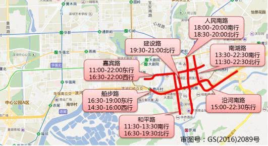人民南路(18:00-20:00南行,18:30-20:00北行),建設路(19:30-21:00北行),嘉賓路(11:00-22:00東行,16:30-22:00西行),南湖路(13:30-22:30南行,11:30-22:30北行),船步路(16:30-19:00東行,14:30-16:00西行),沿河南路(15:00-22:30東行),和平路(11:30-13:30南行,16:30-19:30北行)。