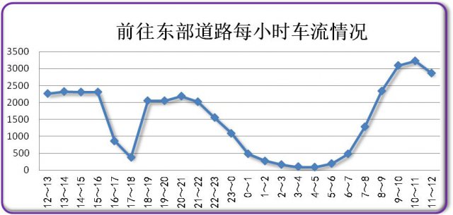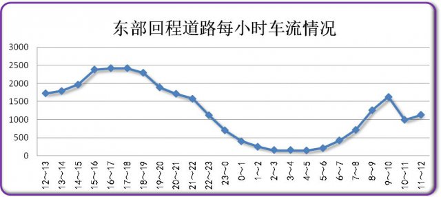 今日上午8時(shí)開(kāi)始,東部回程的車輛增多,9時(shí)達(dá)到峰值,約1629輛。