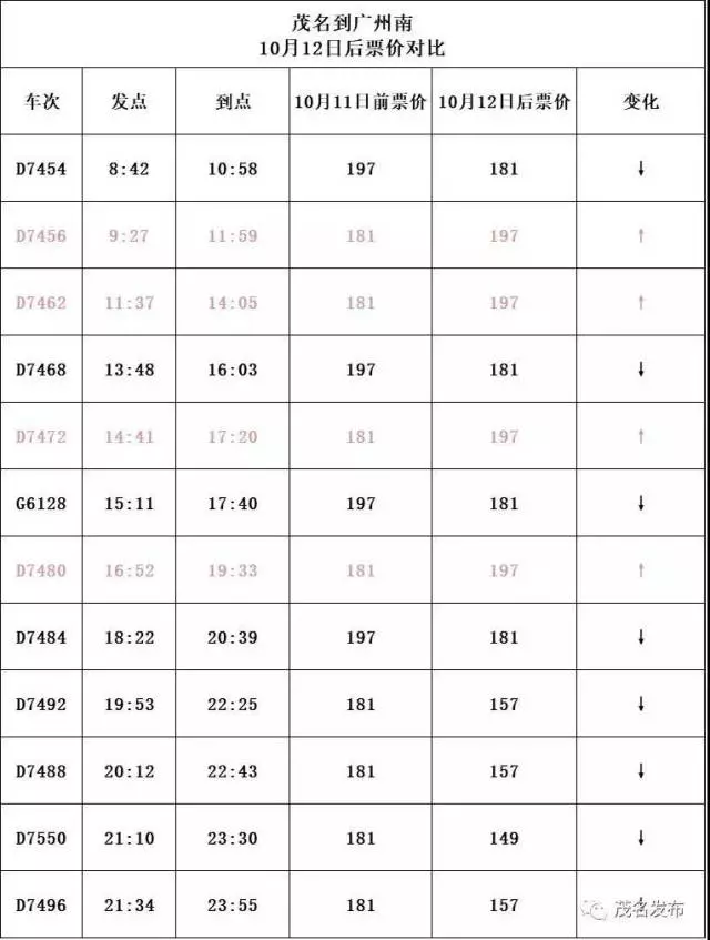 D7451次(7點10分班次)由原來的206元調(diào)整為196元;