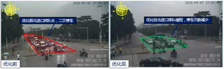 錦程/沙井南環(huán)路口為主、次干道交叉口。為提高通行效率、降低延誤,9月7日,深圳交警優(yōu)化該路口配時方案??紤]到車流主要集中在錦程路,取消沙井南環(huán)搭接,對錦程路采取搭接相位放行模式,優(yōu)化后,晚高峰期間路口北進(jìn)口排隊(duì)車輛從25輛降至15輛,降幅40%,路口總延誤從53s降至40.3s,降幅23.6%。