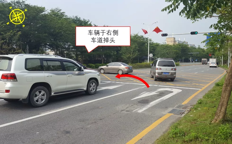 福鳳/騰豐三路口東側(cè)為鳳凰山旅游區(qū),通勤車流較多?,F(xiàn)狀路口未設(shè)置紅綠燈,人車交織嚴(yán)重,交通秩序混亂,易發(fā)交通事故。9月14日,深圳交警啟用福鳳/騰豐三路口信號燈。為解決掉頭車轉(zhuǎn)彎半徑不足問題,進(jìn)一步在距路口約96米處開設(shè)掉頭口,并以最外側(cè)車道作為掉頭車道,同時與福鳳/騰豐三路口實施聯(lián)動設(shè)置燈控掉頭。該路口是寶安首個“一機(jī)兩控”+外側(cè)掉頭微創(chuàng)新路口。