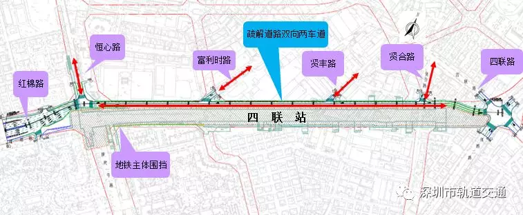 四聯(lián)站位于紅棉路與橫崗一號(hào)路、恒心路交叉口,沿紅棉路東西方向布置,為地下雙層島式車站(局部三層)。紅棉路為東西向主干道,規(guī)劃路寬50m,現(xiàn)狀路寬35m,雙向6車道,車流量較大。車站北側(cè)為新城匯商場(chǎng),西北側(cè)為康樂幼兒園,西南側(cè)為信義錦繡花園,南側(cè)為康樂五區(qū)住宅小區(qū),人員相對(duì)密集。