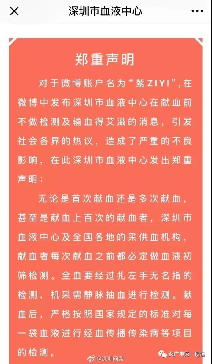 事發(fā)后,深圳市血液中心也在第一時間,發(fā)出鄭重聲明:無論是首次獻血者還是多次甚至是上百次的獻血者,每次獻血都必須做初篩檢測,全血要經(jīng)過扎左手無名指的檢測,機采需靜脈抽血進行檢測。獻血后,嚴格按照國家規(guī)定的標準對每一袋血液進行經(jīng)血傳播傳染病等項目的檢測。
