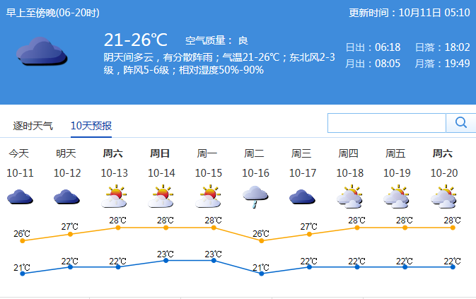 受弱冷空氣影響,預計11~12日有分散小雨,其中11日氣溫20 ℃ ~27 ℃。12日持續(xù)陰天,有分散陣雨,氣溫21 ℃ ~27 ℃。預計此次弱冷空氣影響持續(xù)到周末,13~15日晴天到多云,氣溫開始回升。16日將有新一輪冷空氣進入深圳,有一次降雨過程。