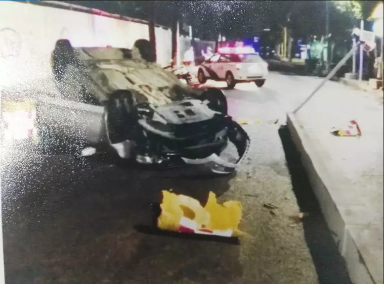 ,小車側(cè)翻撞成了個“四輪朝天”,現(xiàn)場一片狼藉,幸運的是車門開得了,周某便打開車門爬了出來。