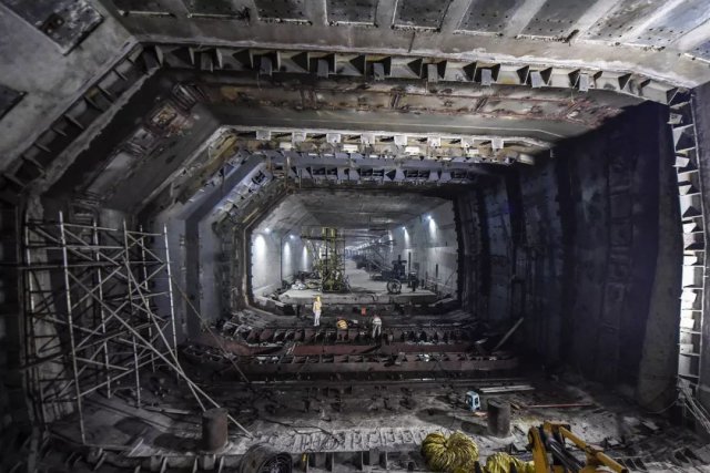 2017年7月7日,港珠澳大橋海底隧道正式貫通。圖為施工人員在港珠澳大橋海底隧道最終接頭處施工。(視覺(jué)中國(guó))
