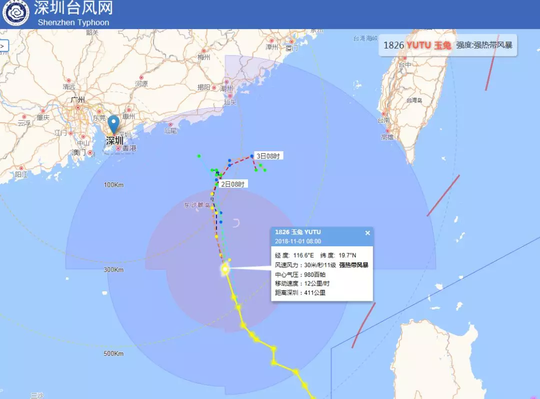 11月1日上午08時臺風“玉兔”位于距離深圳411公里的南海海面上,其中心附近最大風力11級(30米/秒),預(yù)計臺風“玉兔”將以12km/h的速度緩慢北行,2日強度明顯減弱。