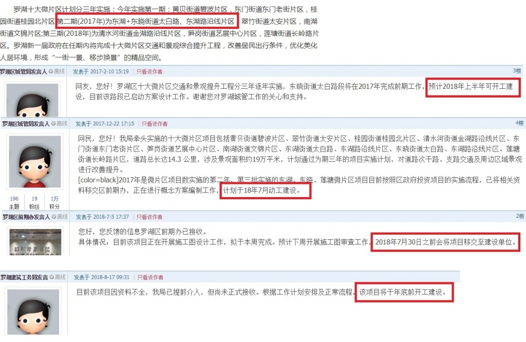 據(jù)了解,為改善居民出行條件,美化居住環(huán)境,羅湖區(qū)于2016年發(fā)布了十大微片區(qū)交通和景觀綜合提升工程計劃。該計劃表示全工程將分三年實施,而太白路-東湖路微片區(qū)屬第二期,應(yīng)于2017年開始動工實施。但截至2018年11月,該項目仍未動工。從網(wǎng)友發(fā)布的截圖上看,一個名為“羅湖區(qū)城管局發(fā)言人”的論壇賬號分別于2017年2月、12月以及2018年7月和8月對太白路-東湖路微片區(qū)景觀提升工程延遲實施的計劃進(jìn)行了回復(fù)。而相應(yīng)的動工日期也從2018年上半年延遲到了2018年底。