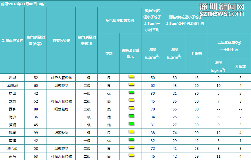 深圳市人居環(huán)境委員會于2018年11月8日14時發(fā)布空氣質量時報