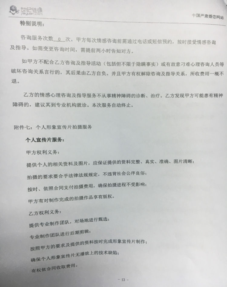 根據(jù)合同,目前服務(wù)時(shí)間已經(jīng)終止,但還有心理咨詢服務(wù)及個(gè)人宣傳片兩項(xiàng)增值服務(wù)未履行。朱女士對(duì)此解釋,這是屬于不收費(fèi)的增值服務(wù),需要客戶自己提出才會(huì)進(jìn)行?!皼](méi)有人跟我說(shuō)過(guò)這個(gè)需要自己提出要求?!眲⑿〗銓?duì)該說(shuō)法并不買(mǎi)賬。