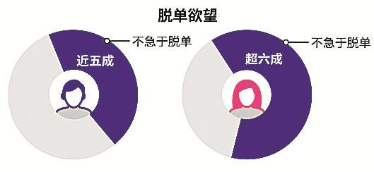 調(diào)查顯示,在脫單欲望方面,近五成單身男性和六成單身女性表示不急于改變單身狀態(tài)??梢姡瑔紊砟信拿搯斡谥饾u下降。