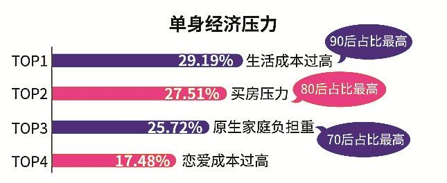 脫單難點(diǎn)中的經(jīng)濟(jì)壓力層面分析發(fā)現(xiàn),生活成本過(guò)高是影響脫單的最大單身壓力,其次是買房壓力,原生家庭負(fù)擔(dān)重以及戀愛(ài)成本過(guò)高。