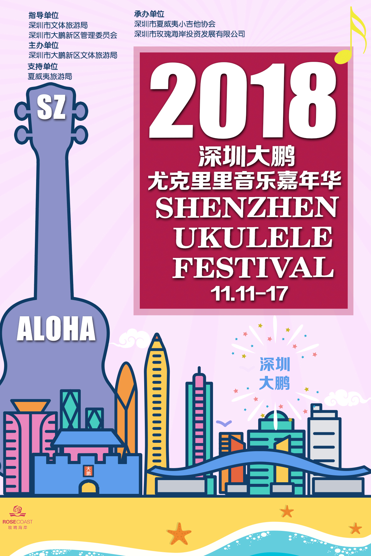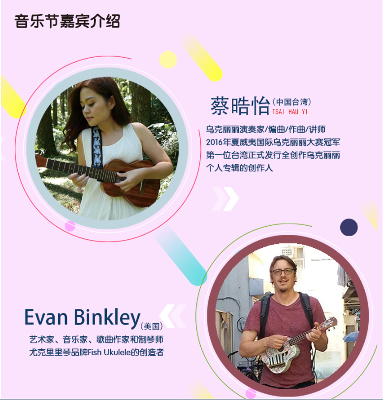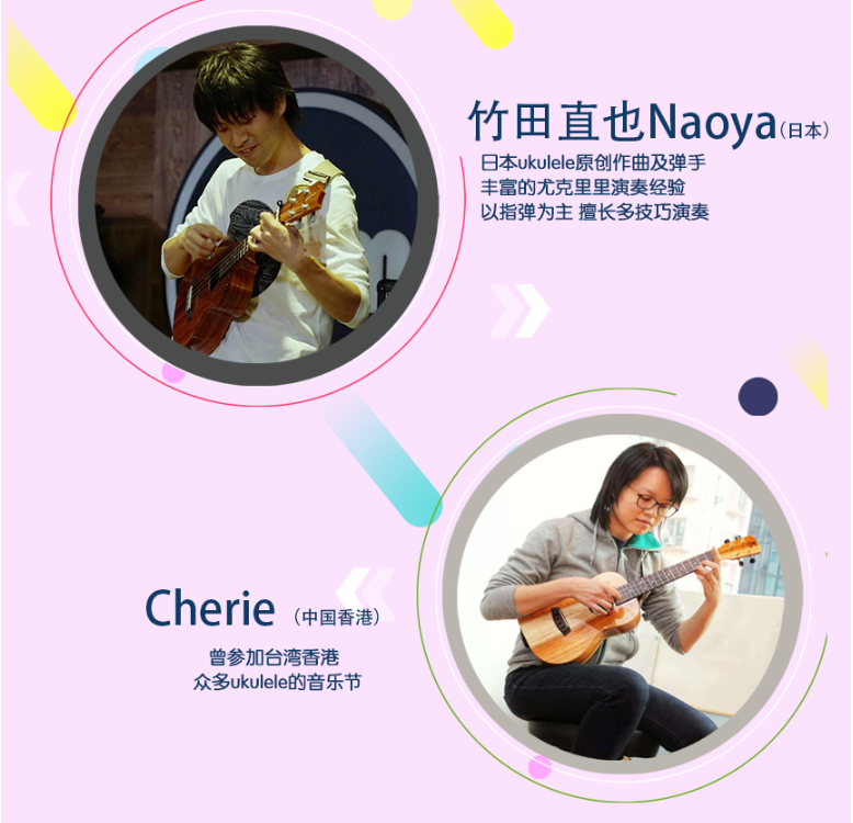 其中全民參與嘉年華音樂會(huì)11月17日的將會(huì)在深圳市玫瑰海岸沙灘舉辦,有深圳、香港(中國)、臺灣(中國)、美國、日本、廣州、中山、珠海等地的嘉賓和愛好者近50組表演者帶來4小時(shí)尤克里里盛會(huì),表演者年齡跨度更是從5歲到60歲。嘉年華現(xiàn)場除了尤克里里音樂會(huì),還將有Moana夏威夷呼拉舞風(fēng)情體驗(yàn),中國臺灣尤克里里協(xié)會(huì)會(huì)長陳建廷新書《兒童尤克里里英文暢游》深圳首發(fā),中國臺灣尤克里里世界大賽冠軍蔡皓怡原創(chuàng)專輯《航海日志》深圳首發(fā),以及美國尤克里里音樂家、藝術(shù)家新專輯《粉色海豚》尤克里里專輯中國大陸首發(fā)。