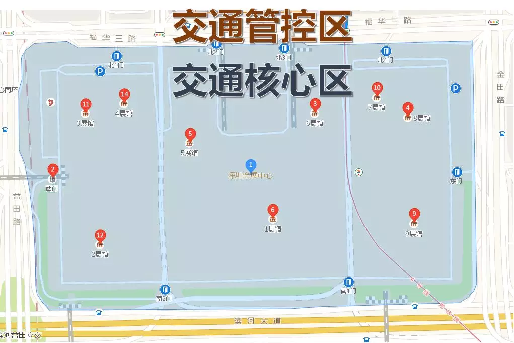福華三路會展中心段(含)以南,濱河大道會展中心段輔道(含)以北,益田路會展中心段(含)以東,金田路會展中心段(含)以西的區(qū)域