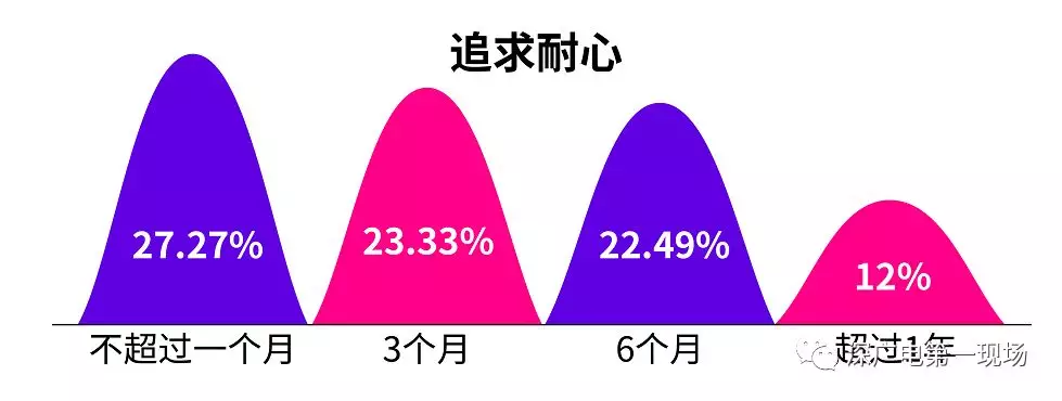 追求時(shí)間不超過一個(gè)月,23.33%的人追求時(shí)間為3個(gè)月,另外有22.49%愿意追求時(shí)間為6個(gè)月,僅有12%的單身男女追求喜歡的人愿意超過1年。
