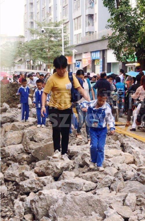另有網(wǎng)友跟帖表示:同學們求學路坎坷,看得揪心!從現(xiàn)場圖可以看到,學生上下學都要穿過工地。路面被挖開,道路邊上只留下很窄的一條小道。上下學高峰期,成群結(jié)隊的學生在碎石穿行,旁邊小道上行人、三輪、電動單車堵成一鍋粥,存在很大的安全隱患。