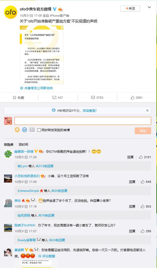 ofo官方微博上大量網(wǎng)民留言要求退款。