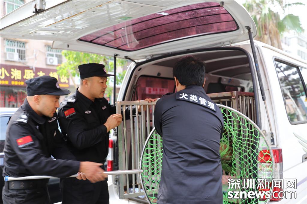執(zhí)法人員將收治的犬只放進(jìn)籠內(nèi)