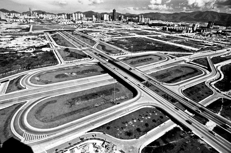 1992年,中心區(qū)四橋一廣場進入緊張施工,圖為金田立交橋的施工情景,背景是蓮花山。 馬樹華 攝