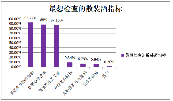 網(wǎng)友最想檢查的散裝酒指標(biāo)有哪些?根據(jù)調(diào)查數(shù)據(jù),網(wǎng)友最擔(dān)心的還是在散裝酒中的非法添加物;其次是酒水是否變質(zhì)過期;排在第三位的是酒精度是否足夠。