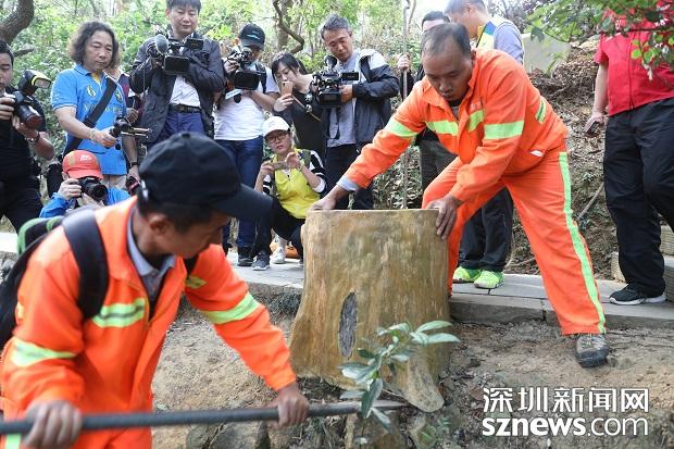 梧桐山工作人員正在對(duì)垃圾桶進(jìn)行拆除