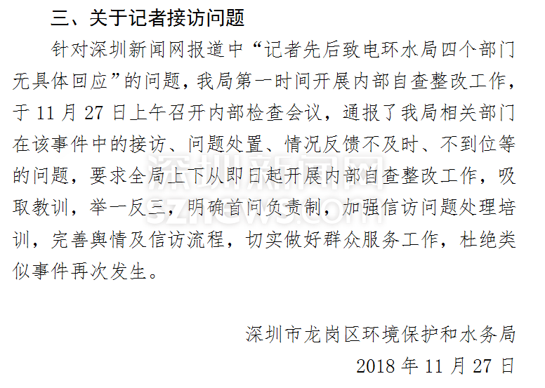 此外,對于前期報道中記者所提及的“先后致電四個部門均無具體回復(fù)”的情況,龍崗區(qū)環(huán)水局也給予了回應(yīng)。他們表示將在日后的工作中完善輿情和信訪流程,切實(shí)做好群眾服務(wù)工作。