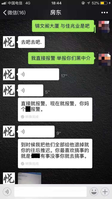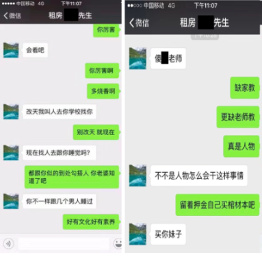 追索押金的過(guò)程并不平靜。10月13號(hào)的一次微信溝通中,余某亮對(duì)李小姐以文字和色情圖片進(jìn)行人身恐嚇、辱罵和性騷擾。記者還獲悉,余某亮至少對(duì)2人女租客進(jìn)行過(guò)性騷擾,也有男租客稱受到余某亮等人的人身恐嚇。