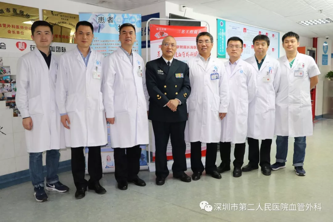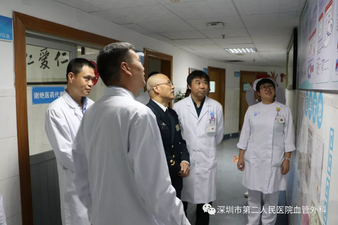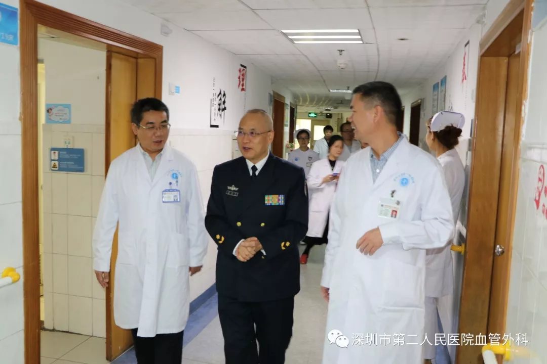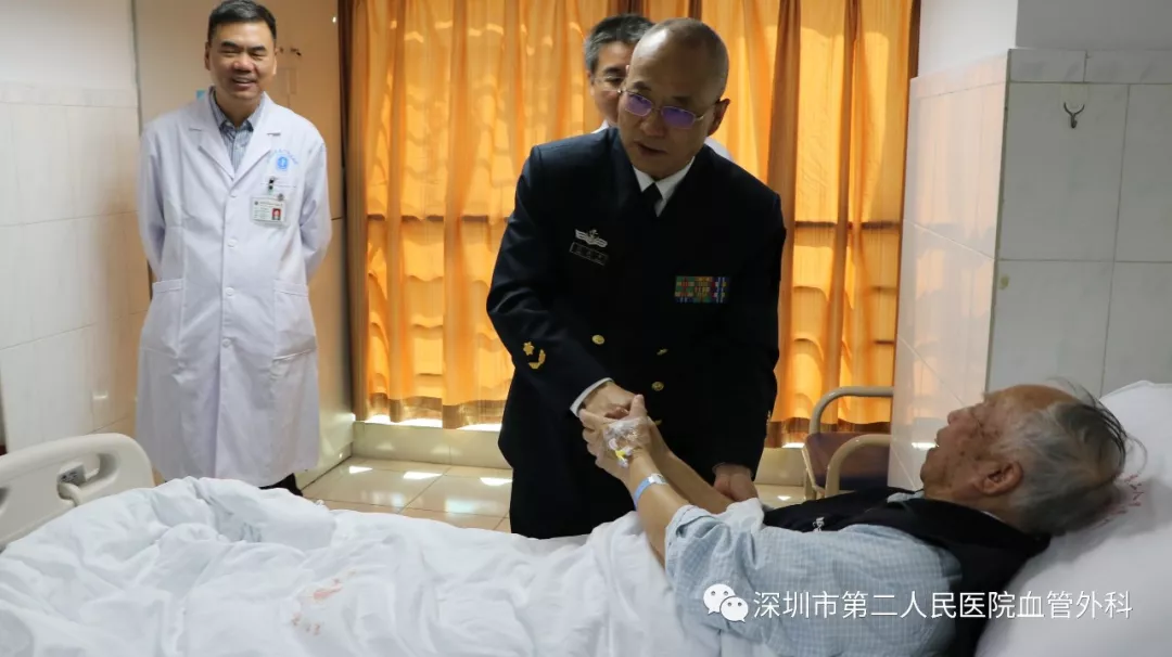 座談會(huì)結(jié)束后,景在平教授、趙永勝副院長(zhǎng)與科室醫(yī)護(hù)人員一起,進(jìn)行了床邊臨床教學(xué)查房,同時(shí)為一位腹主動(dòng)脈瘤疾病患者會(huì)診?;颊呤强姑涝嫌⑿郏ㄏ硎苘娂?jí)待遇),因發(fā)現(xiàn)腹主動(dòng)脈瘤(俗稱(chēng)“不定時(shí)炸彈”)后,一直深受該疾病困擾,一度不愿意接受治療。經(jīng)過(guò)景在平教授詳細(xì)講解后豁然開(kāi)朗,同意接受治療,并要求在景在平教授團(tuán)隊(duì)及朱國(guó)獻(xiàn)主任團(tuán)隊(duì)下進(jìn)行手術(shù)治療。會(huì)診結(jié)束時(shí),老先生緊緊握住景在平教授的手,萬(wàn)分感激。