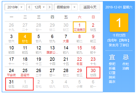 2019年元旦放假3天,其中2018年12月30日至2019年1月1日放假調(diào)休,2018年12月29日(周六)正常上班。