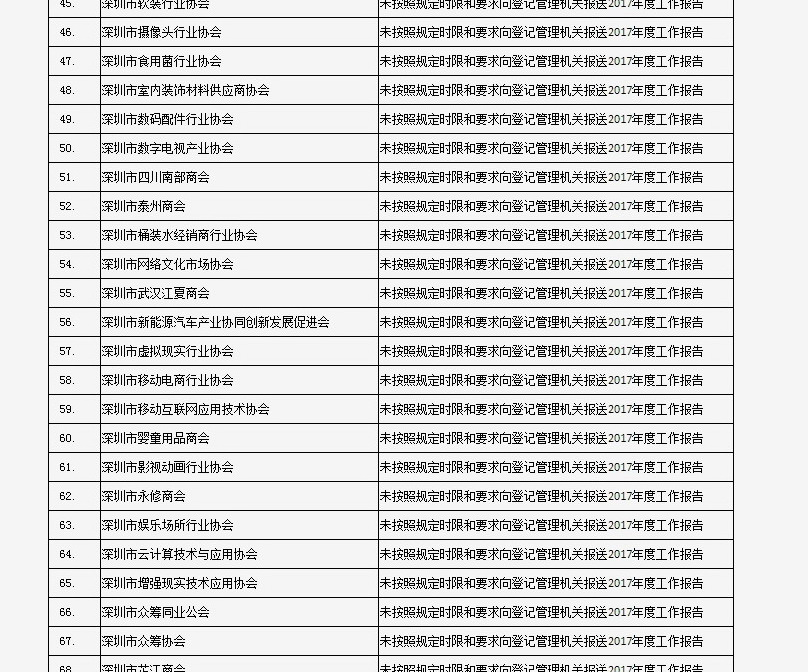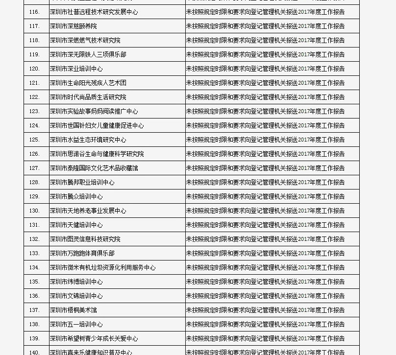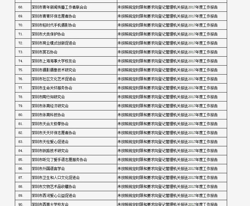 據(jù)深圳市民政局通報(bào),深圳市華中科技大學(xué)校友會(huì)和深圳市深圳大學(xué)校友會(huì)等121家社會(huì)團(tuán)體、深圳市郴州商會(huì)等75家行業(yè)協(xié)會(huì)商會(huì)、企業(yè)家與企業(yè)管理研究院(中國(guó)·深圳)等201家民辦非企業(yè)單位、深圳市明園慈善基金會(huì)等20家基金會(huì),經(jīng)查“未按照規(guī)定時(shí)限和要求向登記管理機(jī)關(guān)報(bào)送2017年度工作報(bào)告”,違反了《社會(huì)組織信用信息管理辦法》《深圳經(jīng)濟(jì)特區(qū)行業(yè)協(xié)會(huì)條例》的相關(guān)規(guī)定,被列入活動(dòng)異常名錄名單。完整版名單已在“深圳民政在線”公布。