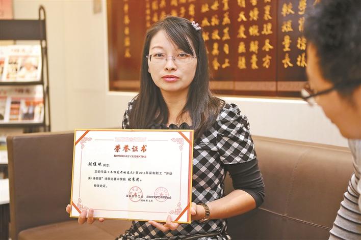 “近期,我剛剛加入了深圳市福田區(qū)作家協(xié)會?!眲⒐鹬楦嬖V記者,她從高中的時候就喜歡寫作?!昂髞?,我來深圳打工之后,不管工作多忙多累,這個愛好都沒有間斷過,一直堅持到現(xiàn)在。它已經(jīng)成為我生命中的一部分了,可以說是一種生活習(xí)慣。”