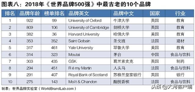 2018年度《世界品牌500強(qiáng)》的平均年齡達(dá)到100.14歲,相比去年的100.19歲略有下降。其中100歲及以上的“百年老牌”多達(dá)213個(gè),美國(guó)以92個(gè)占比達(dá)到4成。英國(guó)的兩所知名學(xué)府牛津、劍橋分別列為最古老品牌的前兩名。學(xué)校的歷史積淀是知識(shí)的沉淀感的最佳表象。除去擁有悠久歷史的著名大學(xué)之外,法國(guó)的老牌公司圣戈班Saint Gobain(353歲)是企業(yè)界擁有最長(zhǎng)歷史的品牌。中國(guó)入選的38個(gè)品牌中只有茅臺(tái)、青島啤酒、五糧液、中國(guó)銀行超越百齡。依行業(yè)來(lái)看,食品與飲料類品牌最古老,100歲以上的入選品牌占到了27個(gè)。