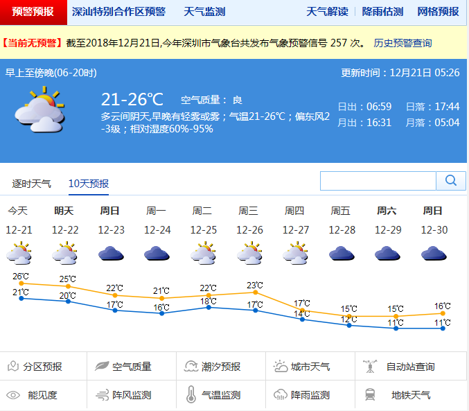深圳市氣象局預(yù)計(jì),21日深圳市多云間陰天為主,早晚有輕霧或霧,氣溫在20-26℃,東風(fēng)2-3級(jí),相對(duì)濕度65-85%;22日多云間陰天,早晚有輕霧,天氣溫暖空氣濕潤(rùn),氣溫在20-25℃;23-24日受弱冷空氣影響,有分散小雨,氣溫小幅下降;25-26日多云可見(jiàn)陽(yáng)光;27日起受不斷補(bǔ)充的冷空氣影響,氣溫逐日下降,天氣明顯轉(zhuǎn)冷。