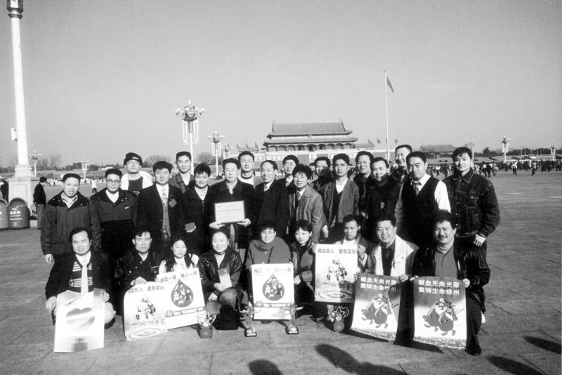 1999年,27位深圳市民獲得全國首批無償獻(xiàn)血金質(zhì)獎杯后在天安門前合影。余海蓉攝
